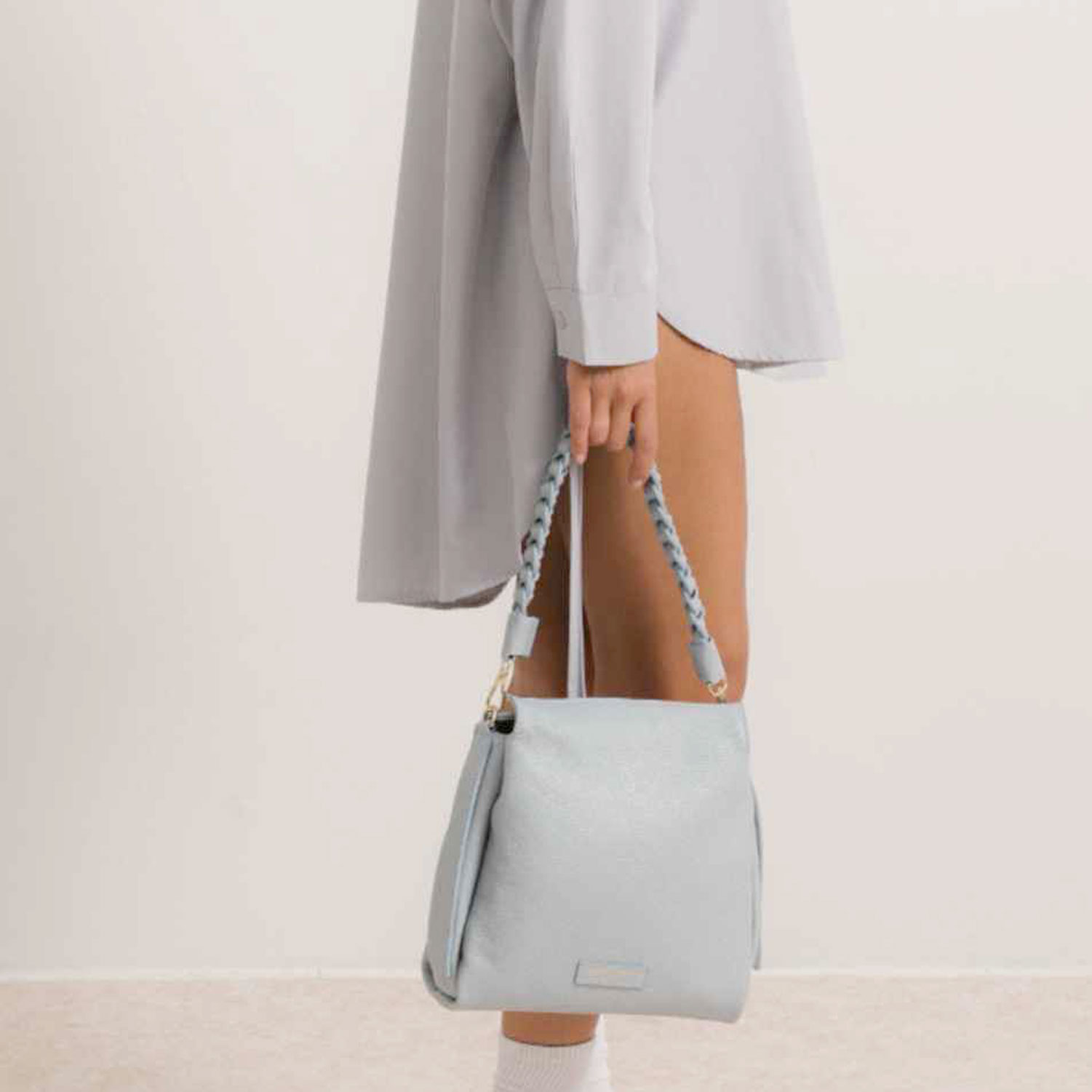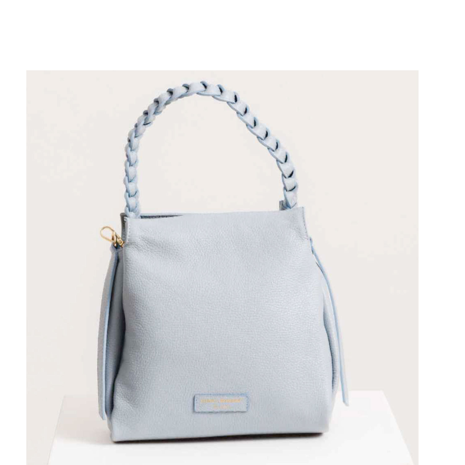 Borsa donna Bianca Borghesi con tracolla in Pelle Blue Aura. Chiusura con zip, divisorio interno, tasche e zip interne, tracolla regolabile ed amovibile. Manico particolare intrecciato. Made in Italy. Authentic Leather