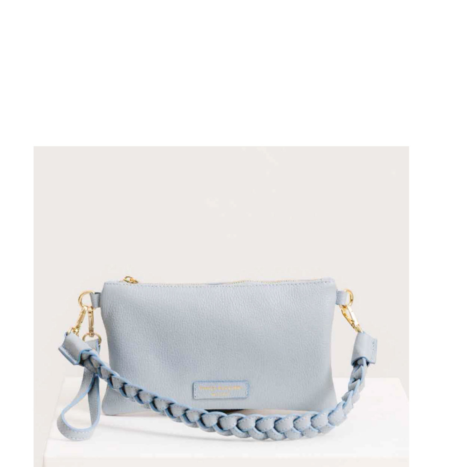 Borsa donna Bianca Borghesi con polsino in Pelle Blue Aura. Chiusura con zip, zip interne, polsino rimovibile. Manico particolare intrecciato. Made in Italy. Authentic Leather